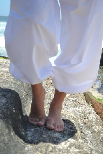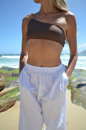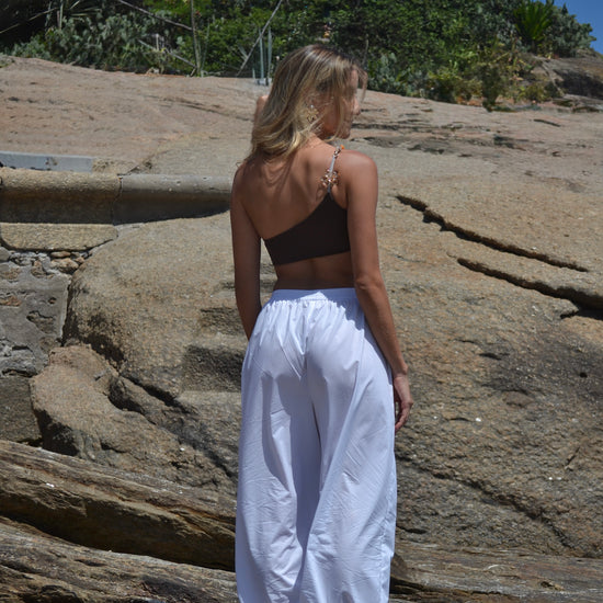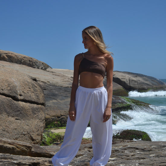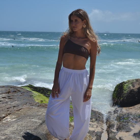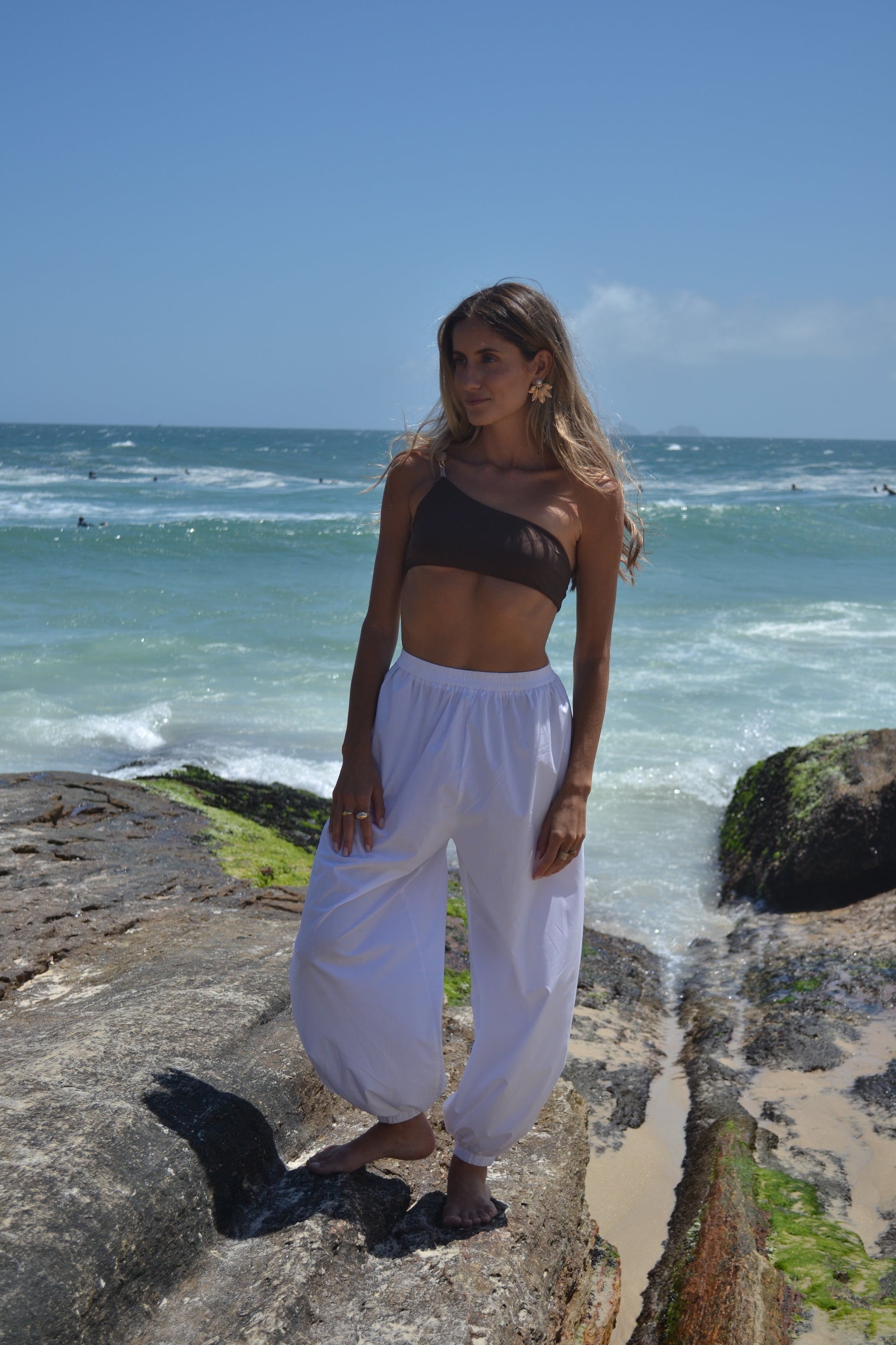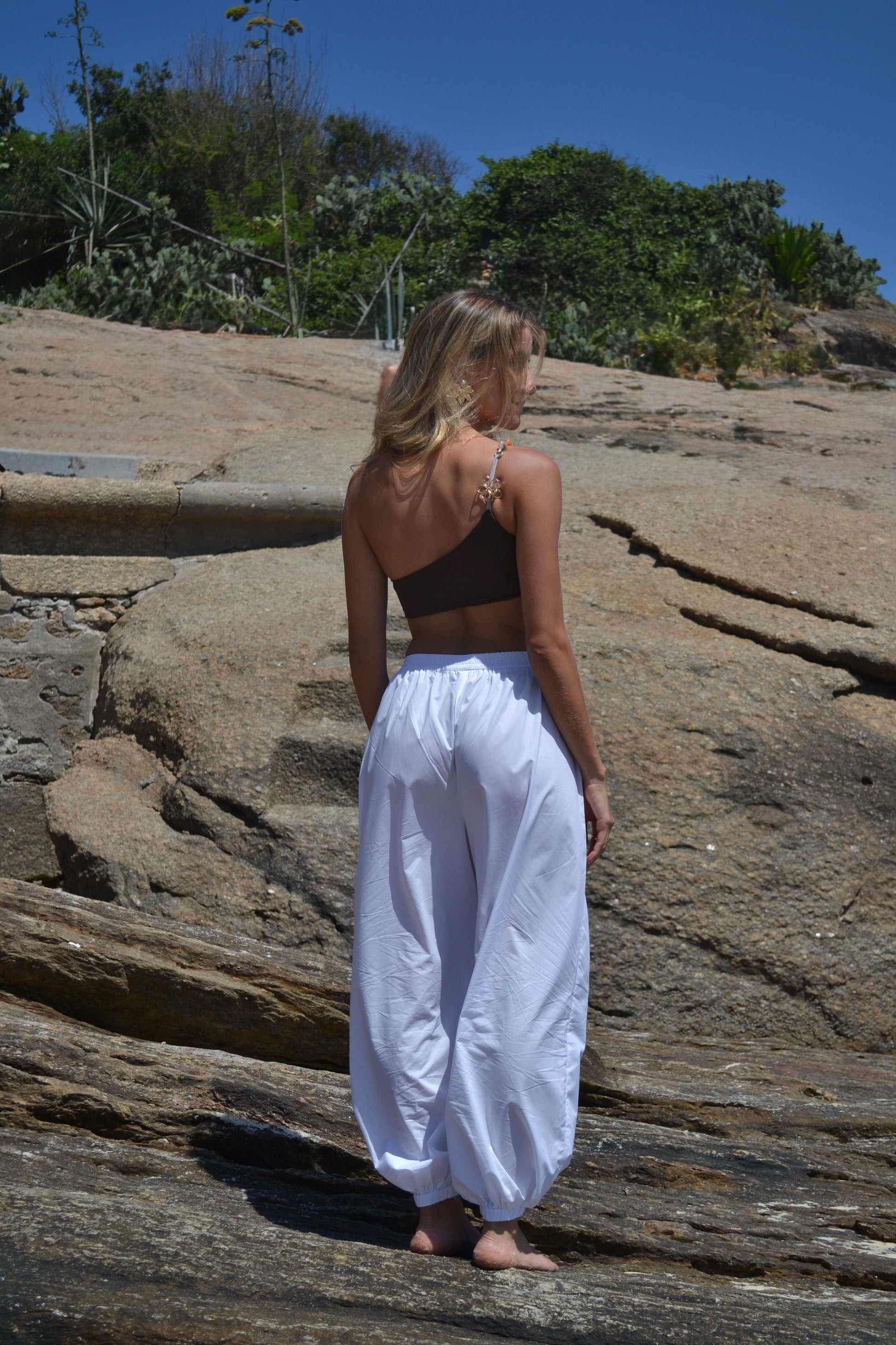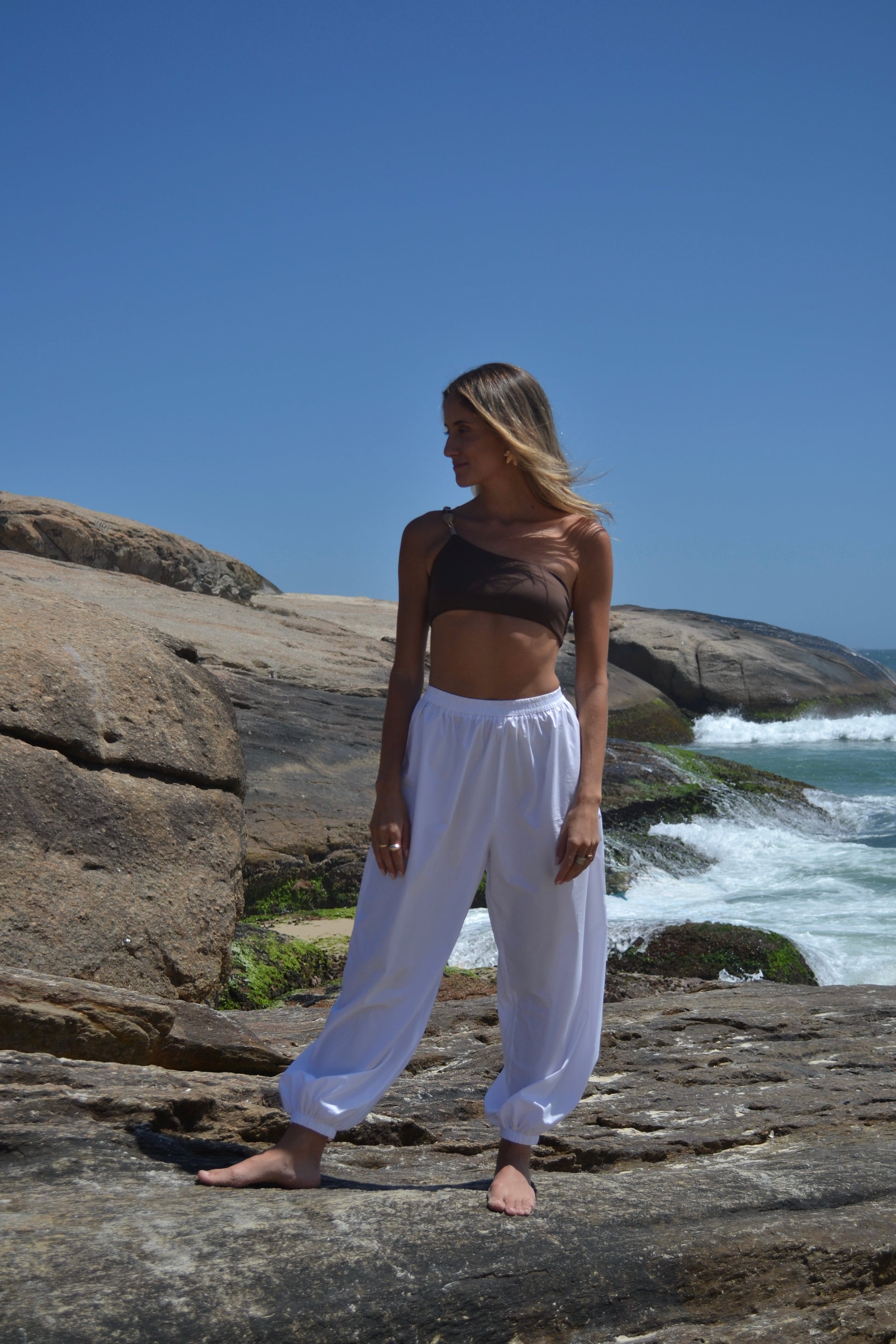 Feita em tricoline, a calça modelo aladim off white possui cós e barra com elástico, além de bolsos laterais funcionais. O tecido estruturado e leve garante um visual despojado e elegante — perfeito para compor produções casuais ou pós-praia com charme contemporâneo.