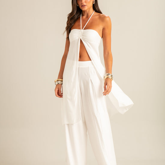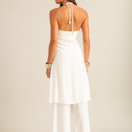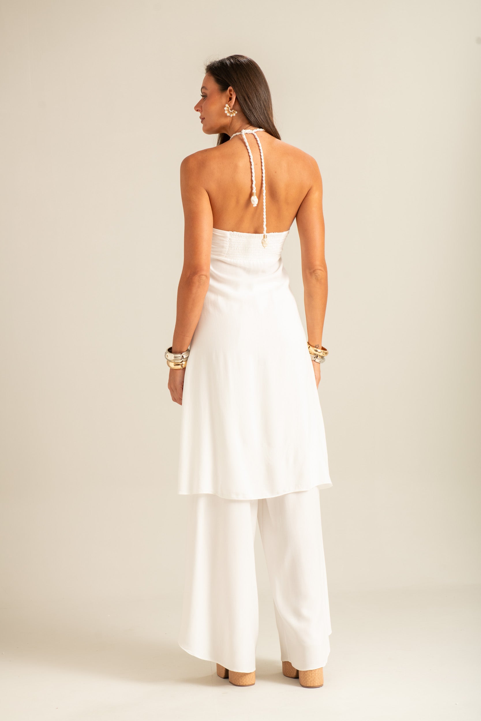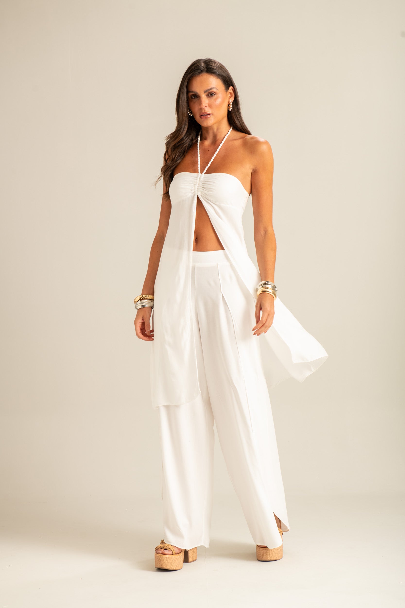 Feita em crepe, a peça possui abertura frontal que traz movimento e delicadeza, enquanto a alça transpassada no próprio tecido, finalizada com ponteiras de pedra, adiciona um toque artesanal e sofisticado. O busto tem forro duplo e oferece excelente sustentação, garantindo segurança ao vestir. Nas costas, o lastex proporciona adaptação ao corpo e conforto ao longo do dia.